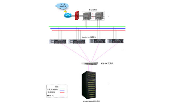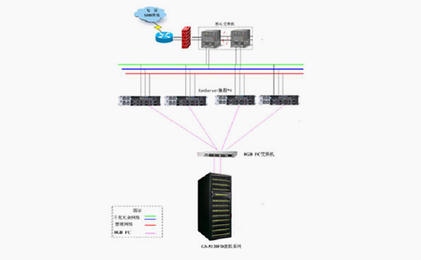 由于傳統的網站結構是數據分布到不同的服務器上,這樣使數據備份難度加大,在對數據做遷移的時候必須停止服務才能進行數據遷移且遷移難度大。根據對客戶需求的評估,本方案中提供4臺寶德PR2710P服務器,每臺服務器虛擬4臺Server,用于客戶數據庫、web服務器等各項應用需求。用其中一臺虛擬服務器安裝XEN的 Xen Center統一管理平臺,對物理服務器和虛擬機在一個控制臺里面統一管理。用一臺虛擬服務器做專門做備份服務器,安裝備份管理軟件,及時備份虛擬機。采用第三方的備份服務器在備份的過程中只占用備份服務器的資源,而不會占用任何業務機器的資源。實現Xen的各種功能需要共享存儲的支持,提供1套寶德的存儲GS-5120FD系統,提高可用性,保障業務的連續性。利用Xen的虛擬化架構,服務器數量從以前的20臺減少為現在的5臺服務器,大大降低了服務器數量,減小了服務器的電力、維護等各種開銷。同時利用Xen虛擬化架構的一系列對業務連續性、靈活性的保證,雙光纖通道和共享存儲,提高業務的運行質量,保障業務的連續性。