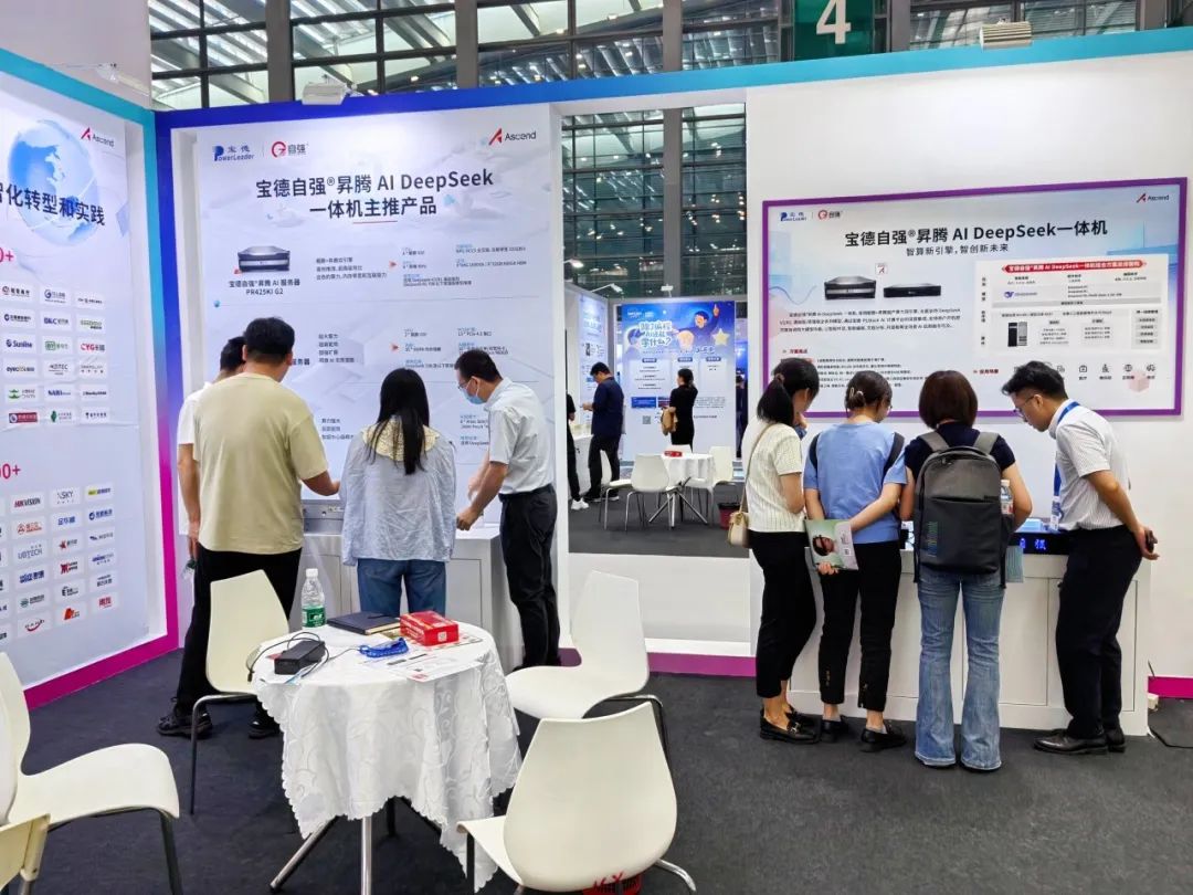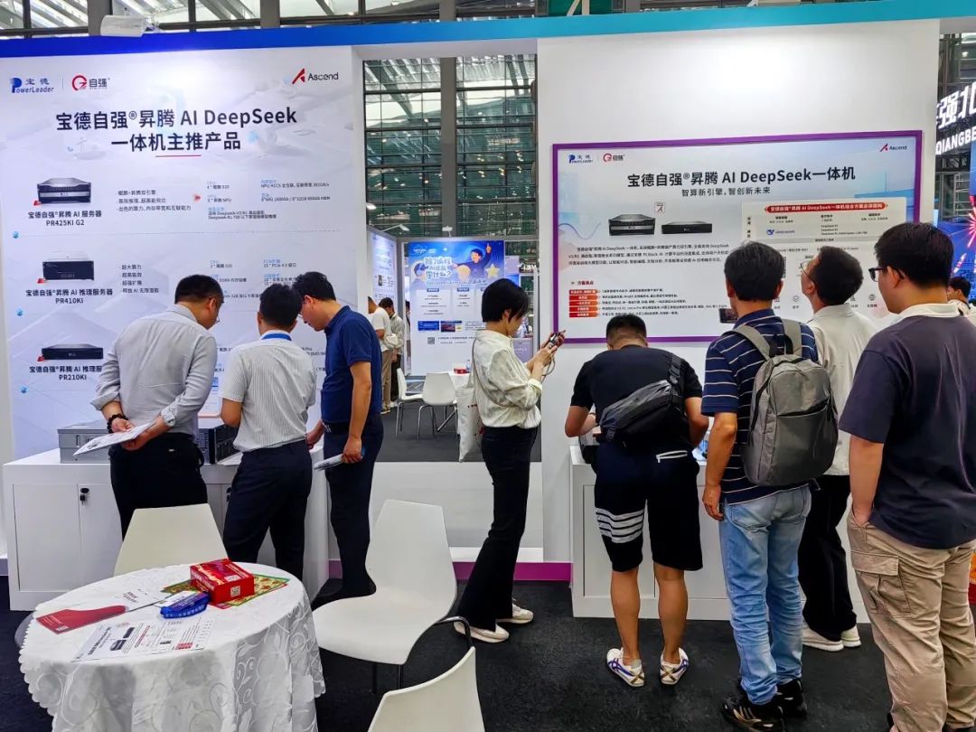 本屆博覽會氣氛熱烈、人氣火爆,寶德展位也是人流如織,尤其是重點展示的自強(qiáng)®昇騰AI Deepseek一體機(jī)解決方案以及PR425KI G2、PR210KI等明星產(chǎn)品,深度集成寶德PLStack AI計算平臺與DeepSeek全系列模型,支持國產(chǎn)大模型高效開發(fā),憑借超強(qiáng)算力、開箱即用、場景化適配、高效能運(yùn)行等優(yōu)勢,吸引了大量參展觀眾駐足交流。