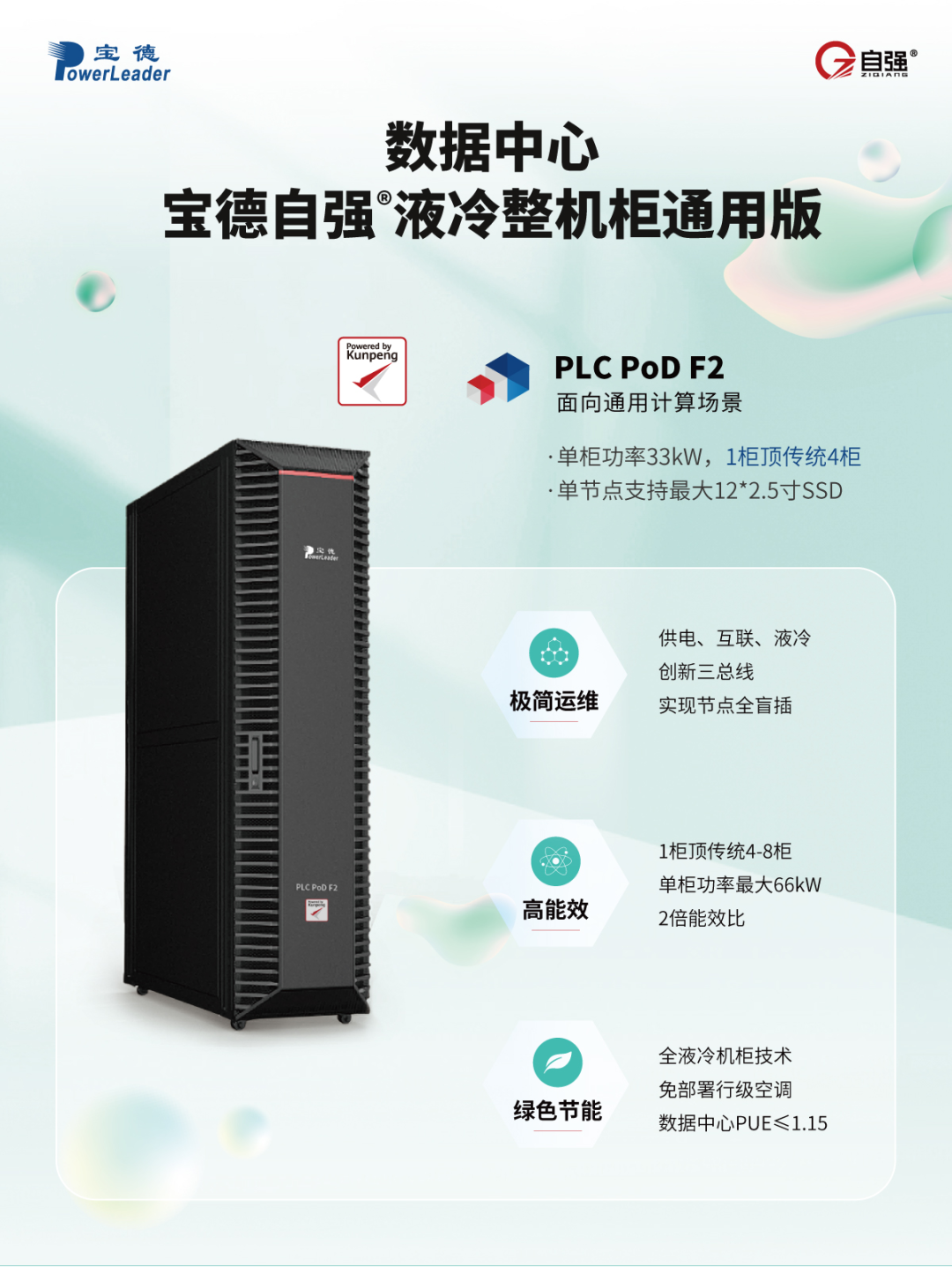 根據客戶的不同需要,基于x86架構和ARM架構,寶德分別推出兩個系列的機柜級液冷系統——寶德液冷整機柜系統Poseidon1000E和寶德自強®全液冷整機柜PLC PoD F2,并且針對不具備冷凍水機房的老舊機房散熱升級改造等用戶,依據不同液冷規模分別提供風冷-液冷和液冷-液冷的機柜液冷方案,前者改造成本低,即買即用,適用于小規模,后者散熱功率范圍大,適用大規模散熱集群。
