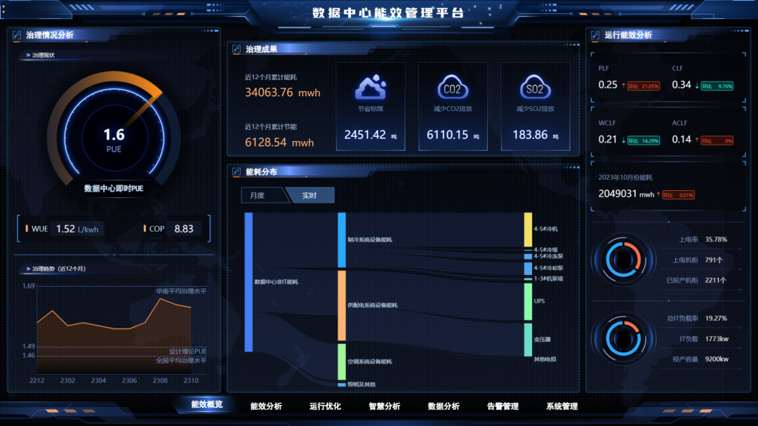 針對數據中心的能耗環節問題,系統采用機理調優進行精細化管理。例如氣密性問題、水力不平衡問題、末端空調負載不均衡問題、冷卻塔和泵的能耗震蕩問題等,通過專家經驗或數據分析結果,建立機理模型,不斷試錯尋找最佳能耗控制模型,為數據中心提供能效診斷和調優方案。為了精準執行運營決策,系統提供了一個統一的全局監控門戶,實現對多個數據中心運營信息的集中監控和管理,達到精細化群控的目標。