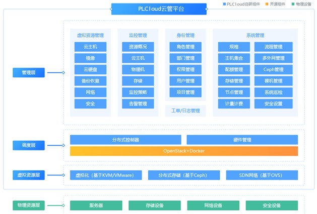 PLCloud云管平臺主要包括虛擬資源管理、監控管理、工單管理、日志管理、身份管理、系統管理等功能,集中了彈性可擴展計算、分布式塊存儲和軟件定義網絡(SDN)等核心技術,通過對硬件設施進行虛擬化處理,形成云化的資源池,該資源池可按需為每個用戶提供基礎IT資源,包括計算資源、存儲資源和網絡資源,快速適應動態變化的業務需求,實現彈性資源分配。