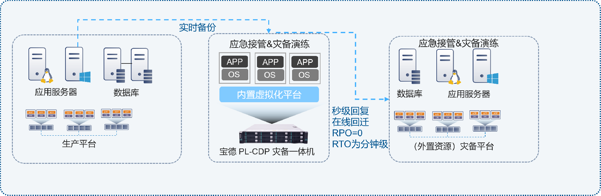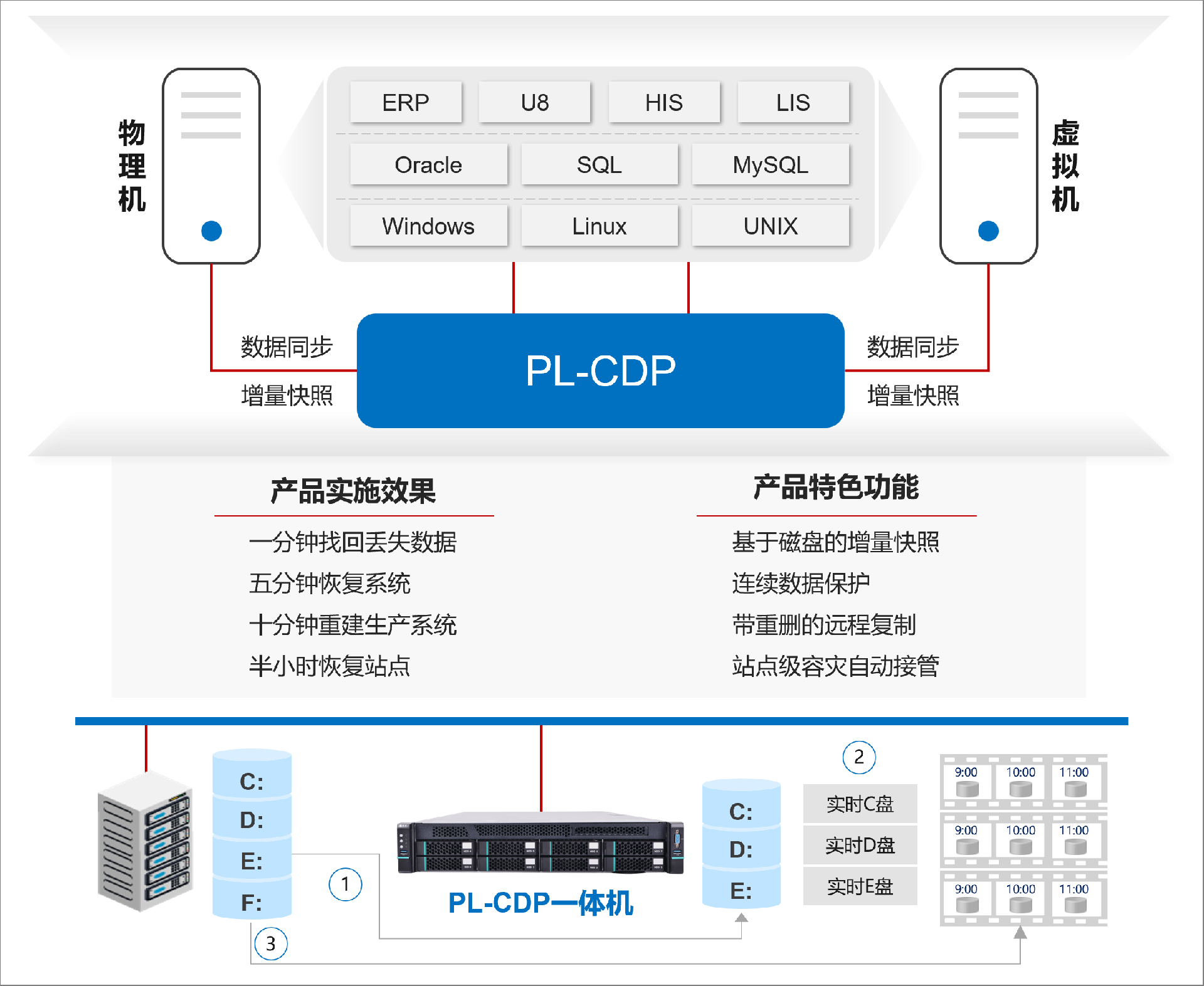PL-CDP實時備份系統可提供演練、驗證、測試的備份數據的可用性,可通過容災系統記錄源端任意時間點IO變化,構建成業務主機的多數據副本;基于內置或外部接管平臺,實現在線業務系統的數據備份、業務容災、仿真測試;簡化用戶業務連續性的綜合保障性方案的復雜度,降低各種風險。