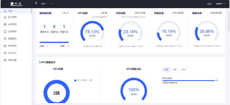 平臺支持服務(wù)器集群統(tǒng)一納管,整合硬件資源,集群化管理和使用。并以套餐的形式對用戶分配硬件資源。針對大模型可一鍵生成單機(jī)多卡、多機(jī)多卡等分布式訓(xùn)練框架環(huán)境;針對多用戶小任務(wù)可對GPU進(jìn)行切分使用,提高資源利用率。
