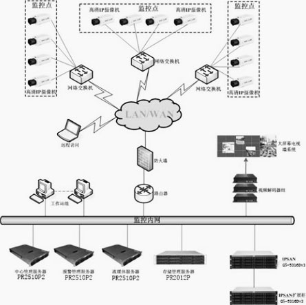 前端攝像機全部采用高清IP攝像頭,通過網絡接入監控中心,在監控中心,我們采用寶德PR2510P2作為管理服務器、流媒體服務器、報警管理服務器,采用寶德PR2012P為存儲管理服務器,通過網絡對整個監控系統視頻進行管理和控制,包括前端攝像機參數設置、錄像存儲、錄像回放,權限管理、多畫面實時視頻監控等,后端磁盤陣列對前端所有采集視頻進行集中存儲,磁盤陣列我們采用寶德GS-5316Dv3 IPSAN。GS-5316Dv3為IPSAN存儲,擴容能力強,吞吐量和IOPS值高,能充分滿足中心存儲建設對后續存儲擴容和高清晰視頻數據并發的需求,當需要擴展磁盤空間時,只需在GS-5316Dv3后端直接接上GS-5316Dv3擴展柜即可。